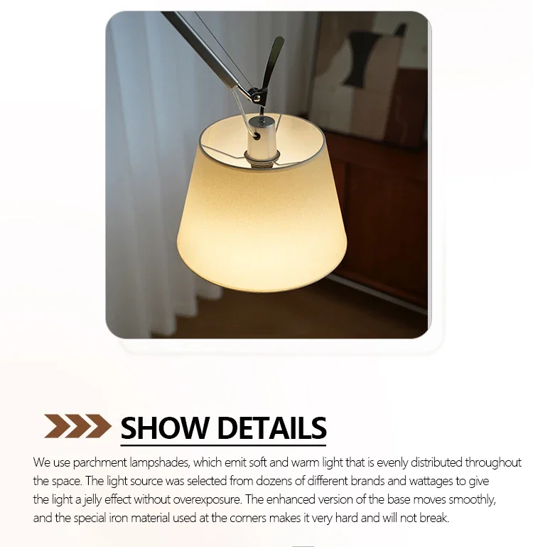 We use parchment lampshades, which emit soft and warm light that is evenly distributed throughout the space. The light source was selected from dozens of different brands and wattages to give the light a jelly effect without overexposure. The enhanced version of the base moves smoothly, and the special iron material used at the corners makes it very hard and will not break.