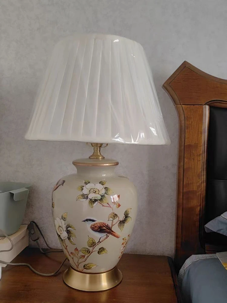 Nordic Ceramictable Lamps for Bedroom Flowers Birds Pattern Led Lamp Fabric Lampshade Home Decoration Living Room Light Fixture